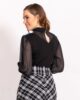 Bluza od crnog trikoa sa kombinacijom muslina. Rukavi od muslina stvaraju elegantan, zanimljiv pad. Manžetne su od trikoa. Veoma idealan model za svaki dan, ali I za svečane prilike. Atraktivan model, sa trakom na okovratniku.