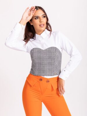 Bluza svečane note u prepoznatljivom dezenu u brokatu. Viskoza sa lepim padom koji daje jednu elegantnu i svečanu varijantu. Model je sa asimetričnim karnerom koji daje dinamiku samom modelu. Bluza je dugih rukava sa kopčanjem na sredini zadnjeg dela okovratnika. U kombinaciji sa pantalonama EP71 dobijamo jedan elegantan kombinezon.