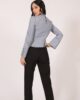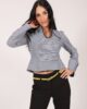 Ova bluza nosi notu prefinjenosti i prestiža, sa dekolteom koji ima otvor u obliku suze, što stvara posebnu stilizaciju koja podseća na klasičnu eleganciju, ali sa modernim twistom. Dugih zvonastih rukava, model je ukrašen manžetnama koje se kopčaju zlatnim dugmićima duž njihove dužine. Bluza se kopča skrivenim rajsferšlusom na boku, čime je očuvan njen elegantan izgled. Autentičnost ovog modela leži u jedinstvenoj stilizaciji na dužini bluze. Izrađuje se od puplina u dezenu pruga, koji dodaje dubinu i luksuzan vizuelni efekat.