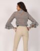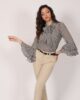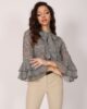 Bluza odiše romantičnim šarmom, dok mašna oko vrata dodaje notu senzualnosti i elegancije. Dugih rukava sa zvonastim manžetnama koje nežno padaju u vidu lepršavih falti, ovaj model unosi dozu sofisticiranosti u svaki outfit. Njena šira forma savršeno se uklapa uz suknje i pantalone visokog pojasa, čineći je idealnim izborom za sve prilike – od poslovnih do svečanih.