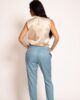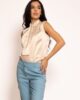 Elegantna bluza bez rukava koja odiše prefinjenošću i modernim luksuzom. Poseban akcenat je na okovratniku, gde stilizovan detalj podseća na kravatu, dajući modelu sofisticiran i modno osvežen izgled. Zahvaljujući jednostavnom, ali efektnom kroju, bluza se lako kombinuje sa pantalonama, suknjama ili sakoima iz nove AMC kolekcije, stvarajući i poslovne i večernje kombinacije.