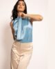 Elegantna bluza bez rukava koja odiše prefinjenošću i modernim luksuzom. Poseban akcenat je na okovratniku, gde stilizovan detalj podseća na kravatu, dajući modelu sofisticiran i modno osvežen izgled. Zahvaljujući jednostavnom, ali efektnom kroju, bluza se lako kombinuje sa pantalonama, suknjama ili sakoima iz nove AMC kolekcije, stvarajući i poslovne i večernje kombinacije.