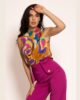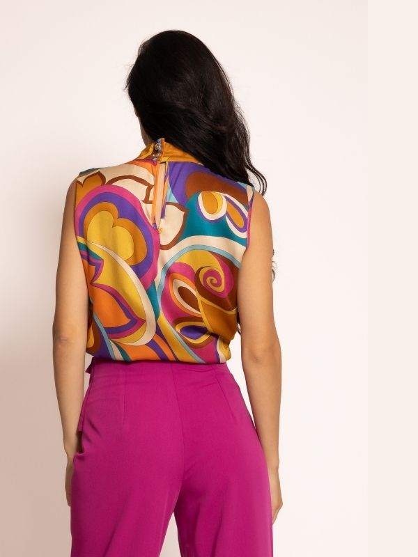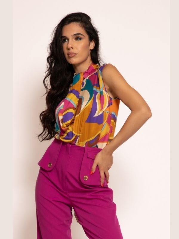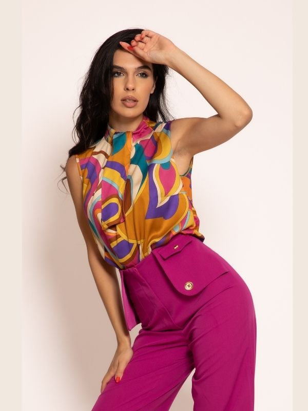 Elegantna bluza bez rukava koja odiše prefinjenošću i modernim luksuzom. Poseban akcenat je na okovratniku, gde stilizovan detalj podseća na kravatu, dajući modelu sofisticiran i modno osvežen izgled. Zahvaljujući jednostavnom, ali efektnom kroju, bluza se lako kombinuje sa pantalonama, suknjama ili sakoima iz nove AMC kolekcije, stvarajući i poslovne i večernje kombinacije.