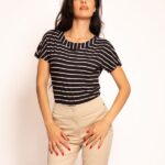 Senzualna haljina, dugih, blago naboranih rukava, perfektnog je kroja. Haljina je laganog materijala, sa kopčanjem dugmićima na sredini prednjeg dela. Dodatno elegantnom, čine je manžetne na rukavima, koje se mogu podešavati. Za naglašavanje ramena, zaduženi su nabori, koji se protežu od ramenih šavova. Dužina zadnjeg dela završava se oštrim uglom, na sredini. Prednju dužinu čine oštri, ali asimetrični završni uglovi. Na vrhu zadnjeg dela, ispod uzdignute kragne, smešten je otvor, u obliku oštrog trougla, odakle kreće sečenje zadnjeg dela. Pojas, sastavljen od bočnik ušitaka, vezuje se na prednjem delu, stvarajući harmoiju, eleganciju i skad.