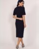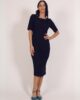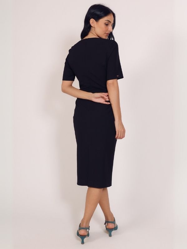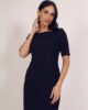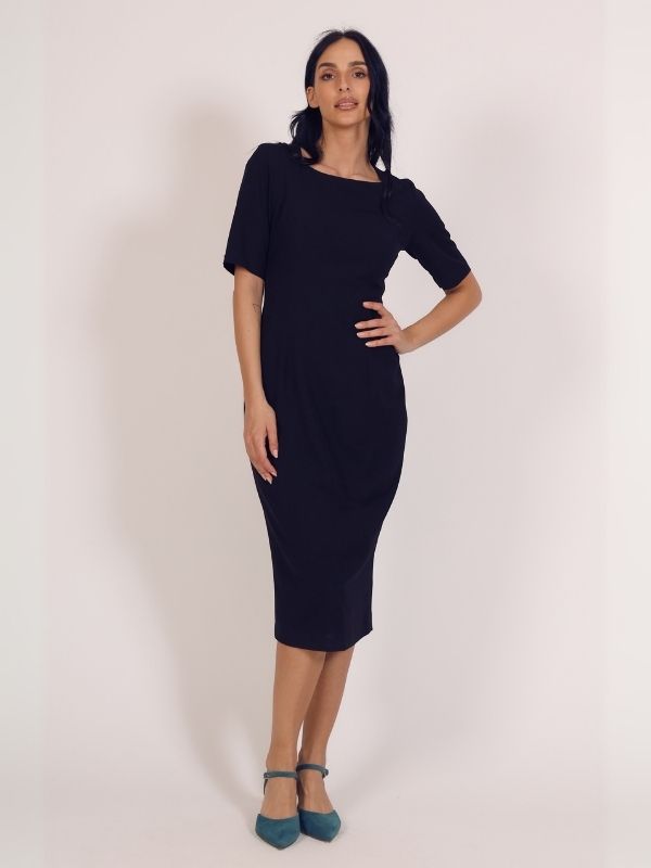 Bazna haljina sa kratkim rukavima. Dužina modela je malo ispod kolena. Krasi je četvrtasti, čamac dekolte. Model savršeno prati liniju ženske figure, tako da ističe njenu lepotu i gracioznost. Kopča se skrivenim rajsferšlusom po sredini leđa. Krasi je diskretan šlic na sredini zadnjeg dela. Model je idealan za svakodnevne, ali i svečane prilike.