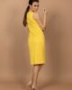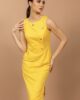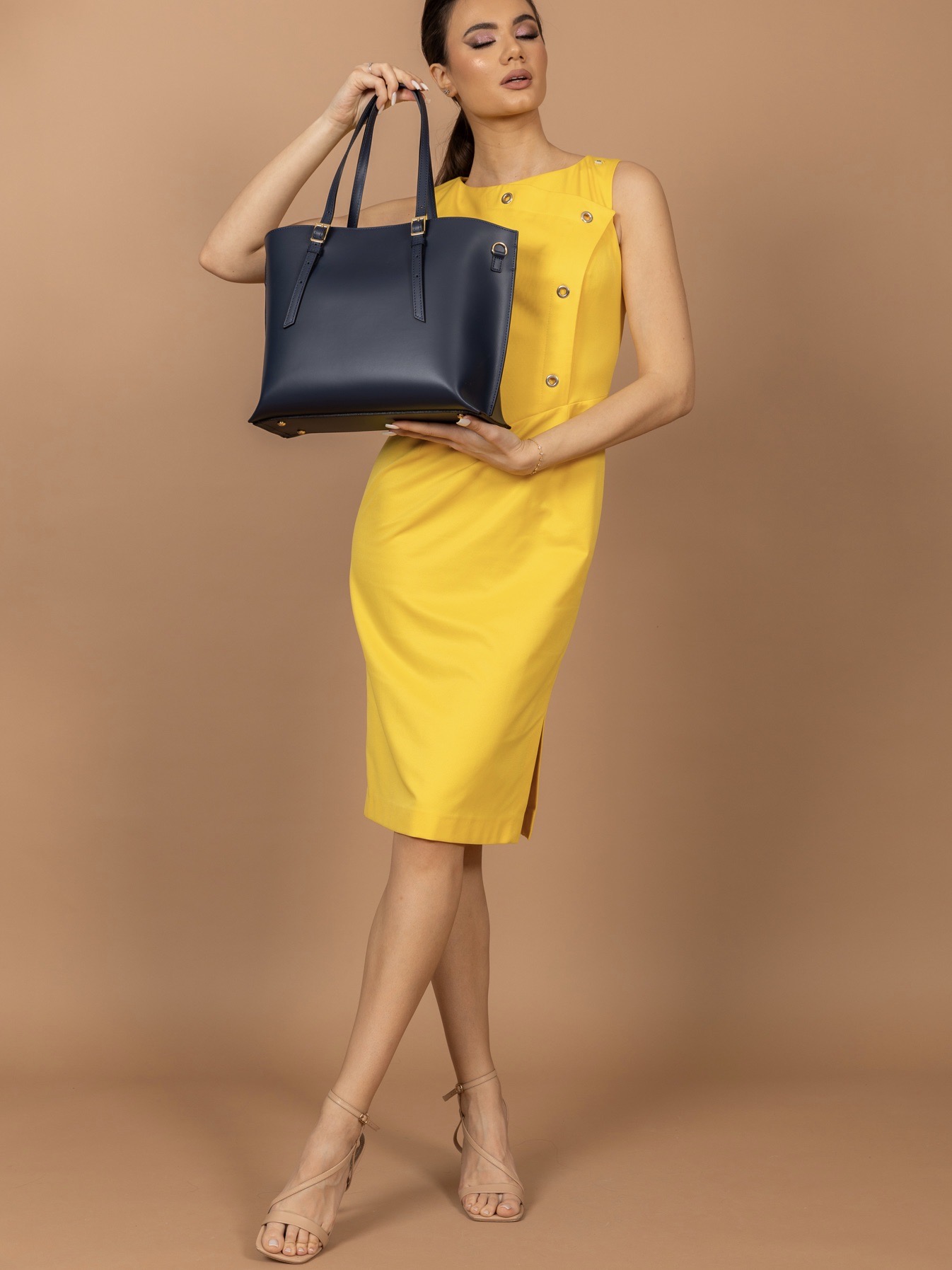 Model haljine prati liniju tela, ističući savršenu žensku figuru. Dužina ispod kolena, sa leve strane se nalazi šlic. Model bez rukava. Krasi je interesantan detalj sa leve strane prednjice kao imitacija preklopa koja je sa malim ringlicama od srebrnog metala. Jedna poslovna, pročišćena forma.