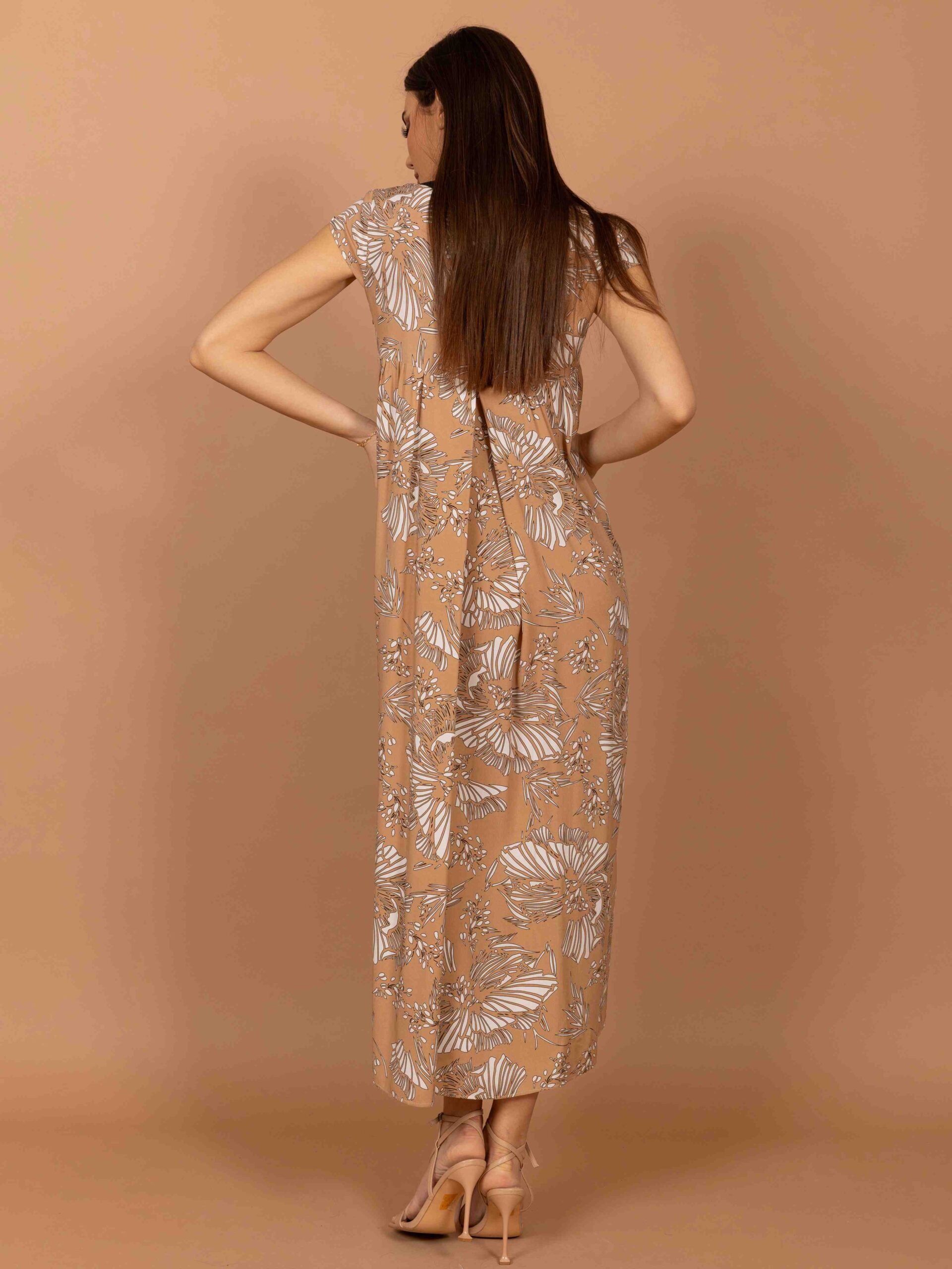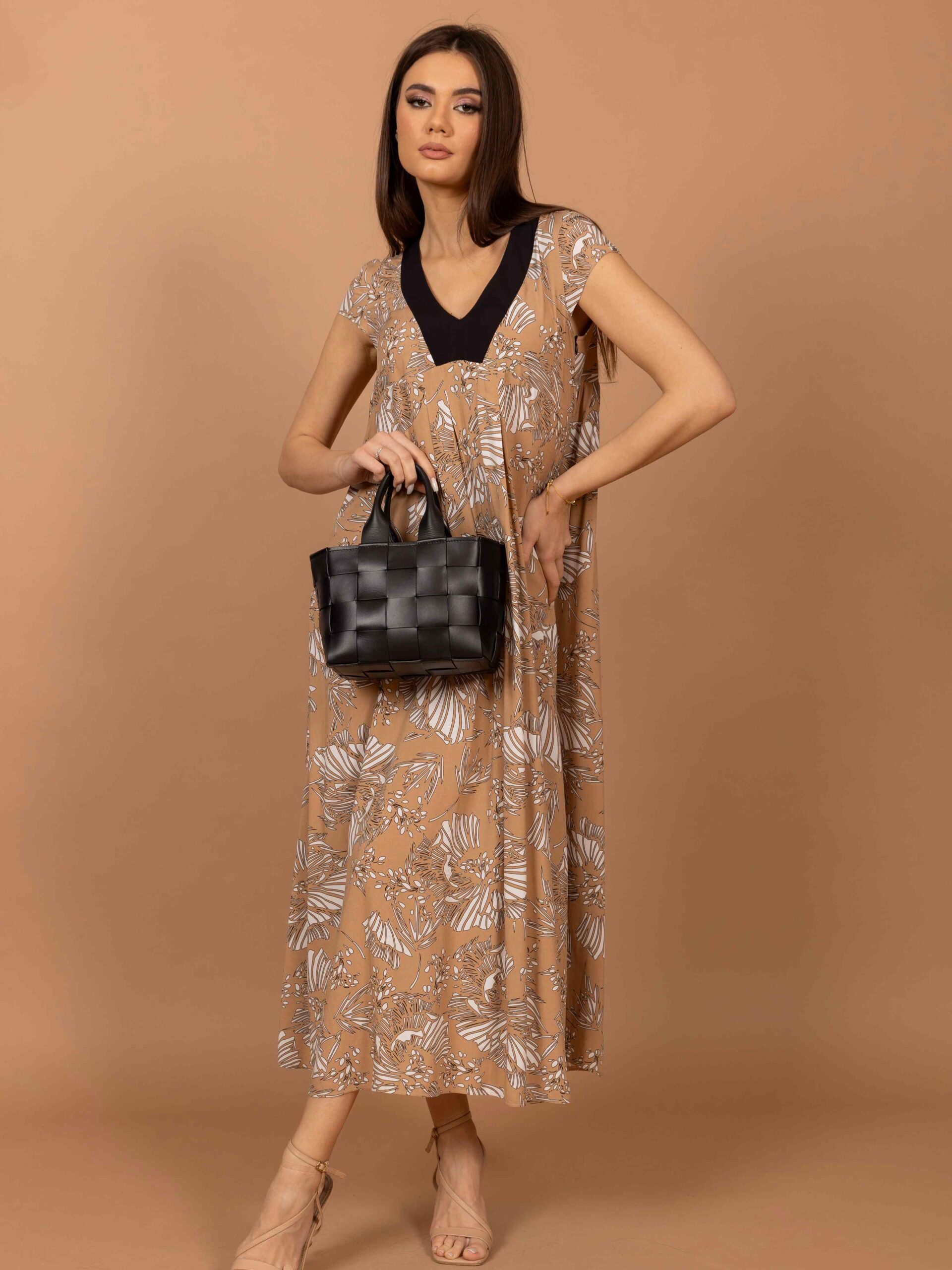 Haljina od viskoze u veoma zanimljivom dezenu. U dugoj formi sa kombinacijom crnog V izreza. Može se nositi sa kaišem ali i bez. Model je savršen za tople letnje dane i sve prilike.
