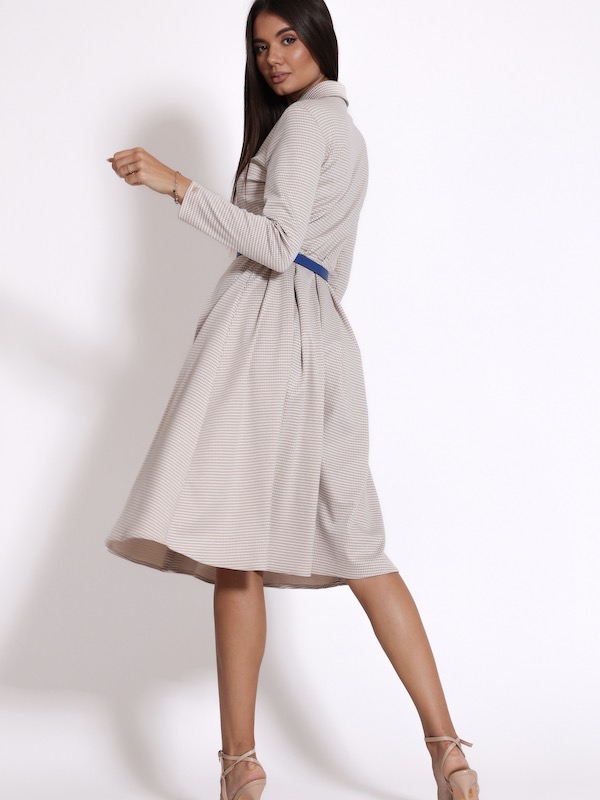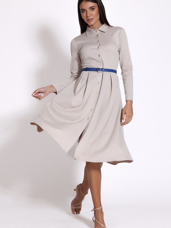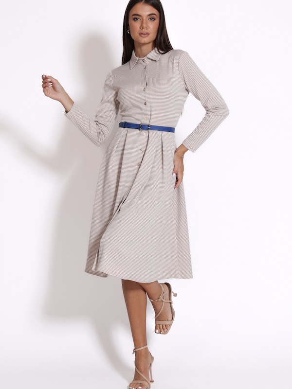 Košulja/haljina, sečena u struku. U struku se nalaze male falte na prednjici i na zadnjem delu. Malo puniji materijal u dezenu sitnog pepita krasi model. Dužina je do pola listova. Naizgled jednostavan model se savršeno može kombinovati sa kožnim kaiševima iz AMC kolekcije koji ga čini vrlo modnim i atraktivnim.