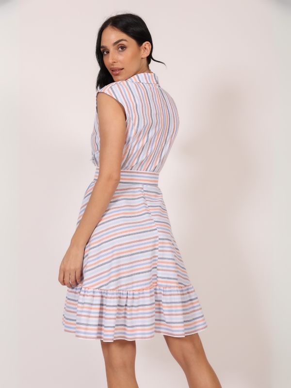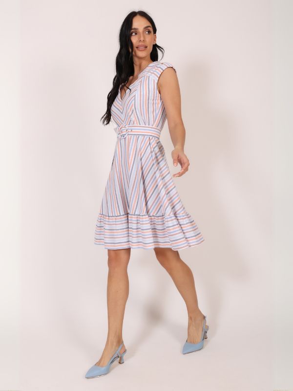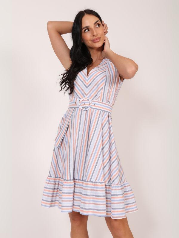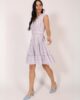 Haljina sa karnerima – trendi i autentična silueta. Haljina dužine do kolena kombinuje modernu ženstvenost i svakodnevnu nosivost. Bez rukava i sa V izrezom, ovaj model odiše lakoćom i elegantnim minimalizmom. Zanimljivi karneri unose dinamiku i čine siluetu razigranom, dok kaiš sa šnalom presvučenom osnovnim materijalom dodatno naglašava struk i daje vizuelnu celinu modelu. Savršen balans casual i svečanog – haljina koju možeš nositi iz dana u veče, bez razmišljanja.