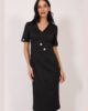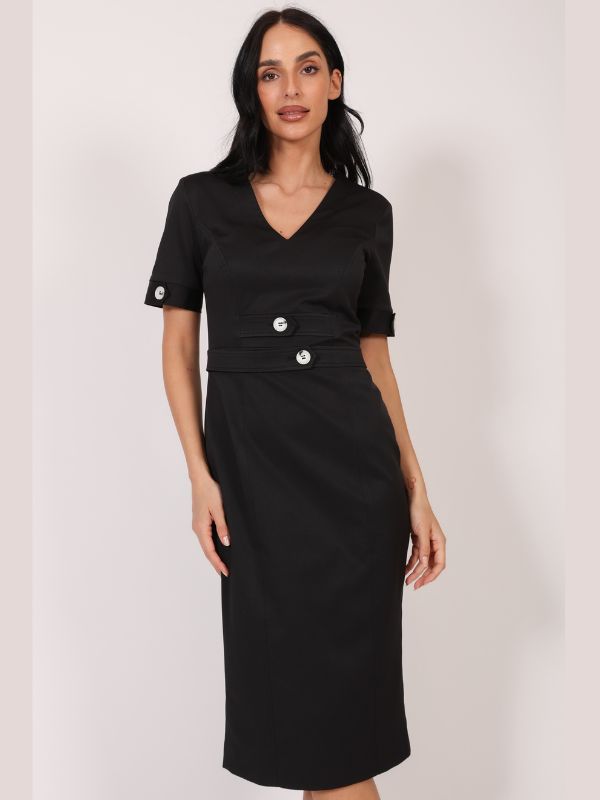 Haljina koja ističe siluetu i odiše sofisticiranošću. Uzak model sa kratkim rukavima, V izrezom i dužinom do kolena prati liniju tela i pruža ženstvenu eleganciju. Prednji deo je stilizovan dekorativnim dugmadima i imitacijom kaiša, koji dodaju notu prefinjenog dizajna. Savršena za poslovne sastanke, svakodnevne aktivnosti ili svečanije prilike – komad koji se lako prilagođava svakom stilu.