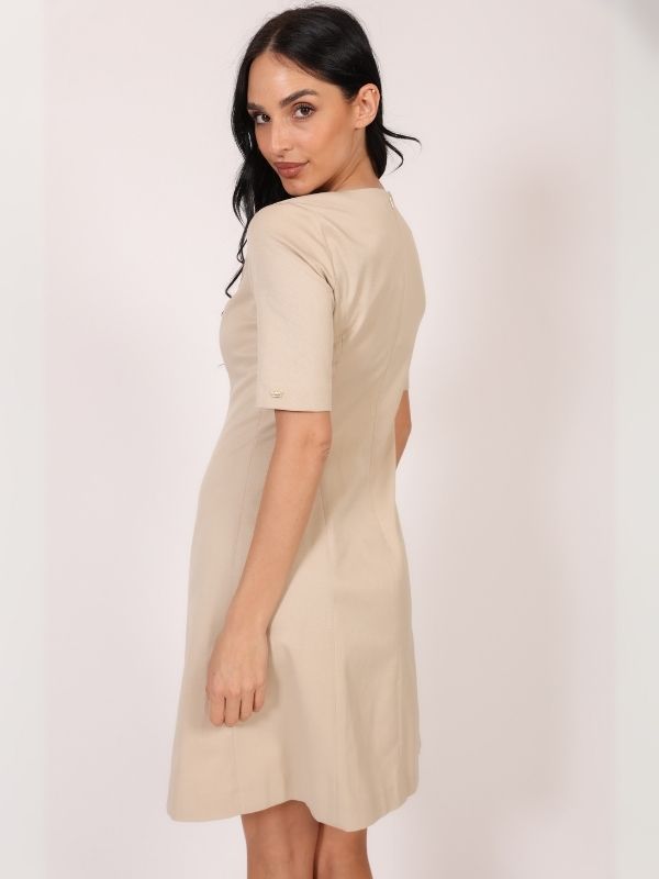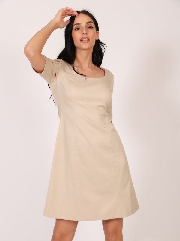 A-forma haljine spaja klasičan dizajn sa savremenom svedenošću. Kratki rukavi dužine do lakta, polu čamac izrez i dužina malo iznad kolena čine je idealnim izborom za razne prilike – od poslovnih do večernjih. Model se zatvara diskretnim rajsferšlusom na leđima, a savršeno se kombinuje sa kožnim kaišem iz AMC ponude, kao i sakoima i mantilima za potpun, sofisticiran izgled.