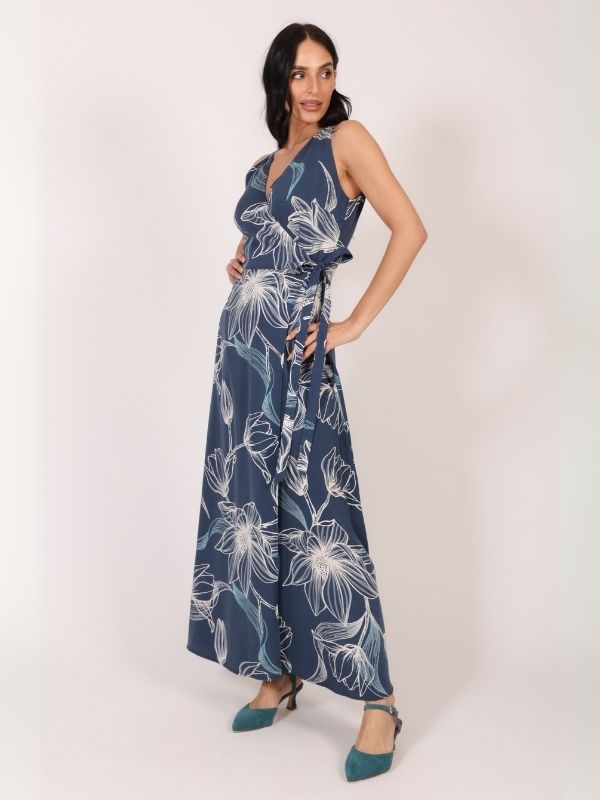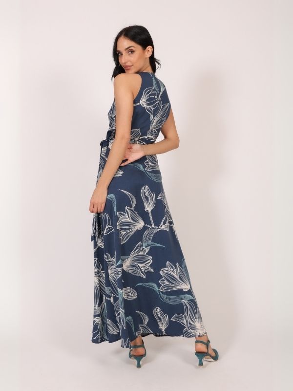 Haljina vrhunske konstrukcije koja spaja sofisticiranost kroja i efektan dizajn. Bez rukava, ovaj model naglašava ramena i vrat, dok se autentičnost ogleda u igri asimetrije i pažljivo odabranom dezenu koji donosi dodatnu dozu karaktera. Poseban detalj je vezivanje na boku, koje kreira elegantan V izrez i vizuelno oblikuje siluetu. Haljina je dužine do članaka, lagano pada i prati pokret tela, pružajući osećaj lakoće i ženstvenosti. Zahvaljujući svojoj svestranosti, savršena je za svakodnevne varijante u urbanom stilu, ali i za večernje i svečanije prilike uz odgovarajući aksesoar.