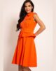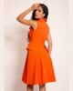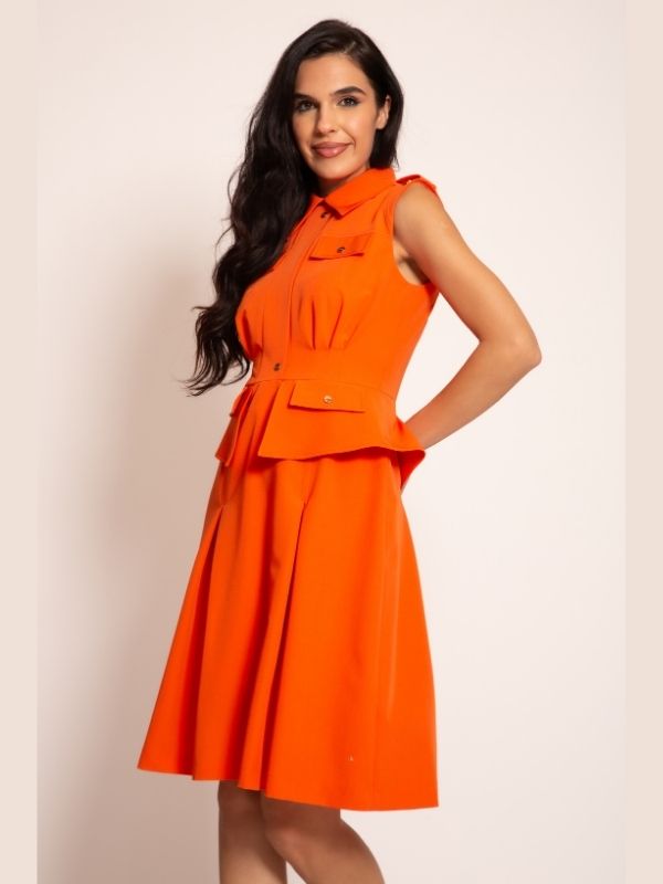 Haljina od kvalitetnog štofa dolazi u izuzetno kreativnom i savremenom izdanju. Gornji deo modela oblikovan je poput košulje bez rukava, sa konstrukcijski preciznom i oštrom kragnom i diskretnim kopčanjem na ramenom delu. Istaknute ivice i patnice na grudima, kao imitacija džepova, dodaju zanimljiv pečat. Dužina haljine do kolena oplemenjena je faltama koje se nežno šire iz ušitaka, dok stilizovani elementi na bokovima pružaju originalnu formu. Skriveni rajsferšlus čuva čist izgled, a zlatna pozamanterija daje luksuzan završni pečat. Idealna je za sve prilike kada želite da spojite eleganciju i moderni look.
