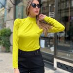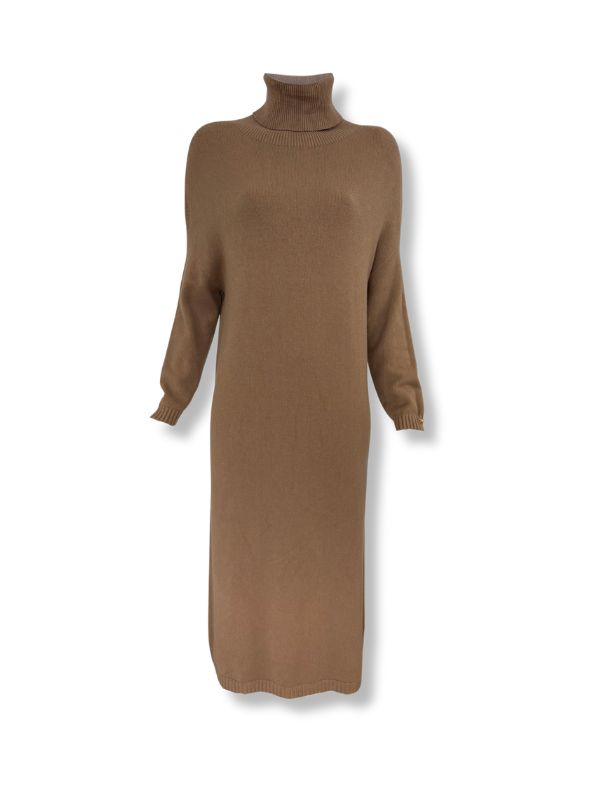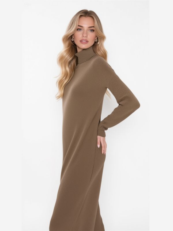 Haljina sa rolkom od trikotaže u kamel boji.