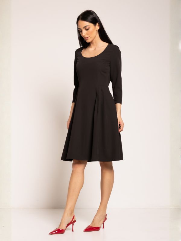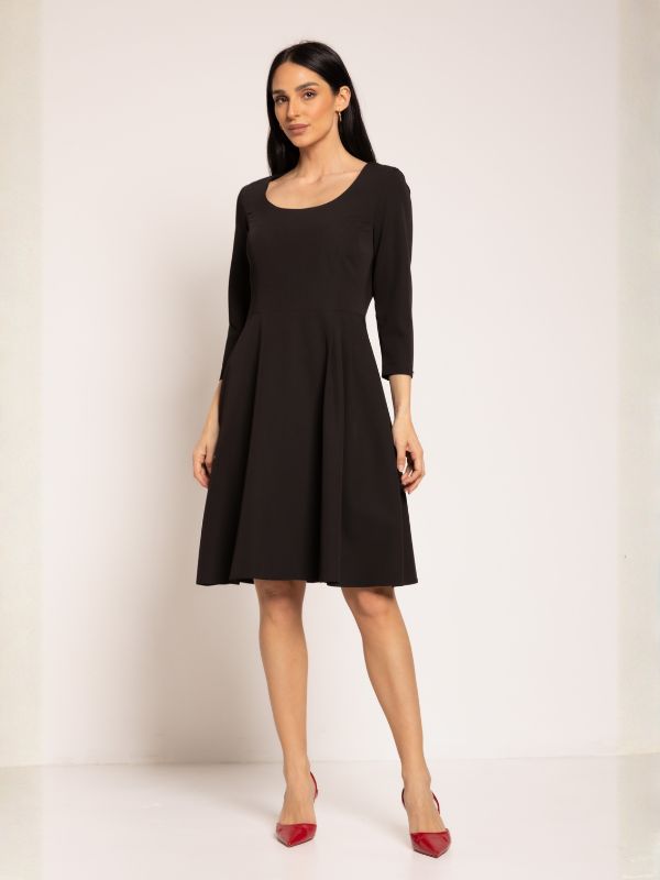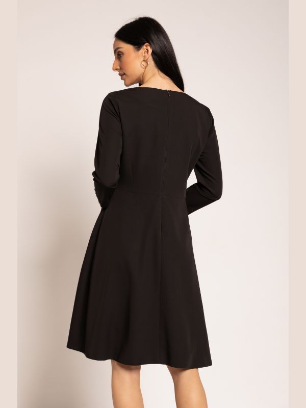 Elegantna A forma haljine, donosi savršen spoj klasične elegancije i modernog dizajna. Rukavi ¾ dužine, dodaju delikatan šarm, dok dužina haljine koja seže do malo iznad kolena, u kombinaciji sa polu čamac izrezom, stvara ženstvenu i laskavu siluetu. Kopčanje na sredini zadnjeg dela skrivenim rajsferšlusom doprinosi minimalističkoj sofisticiranosti ovog modela. Sam pečat modela su diskretne falte sa leve strane. Idealna za sve prilike, haljina se lako kombinuje sa kožnim kaišem iz AMC kolekcije, kao i sa sakoima i mantilima, stvarajući besprekorno usklađene outfite za svaki dan.