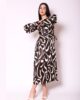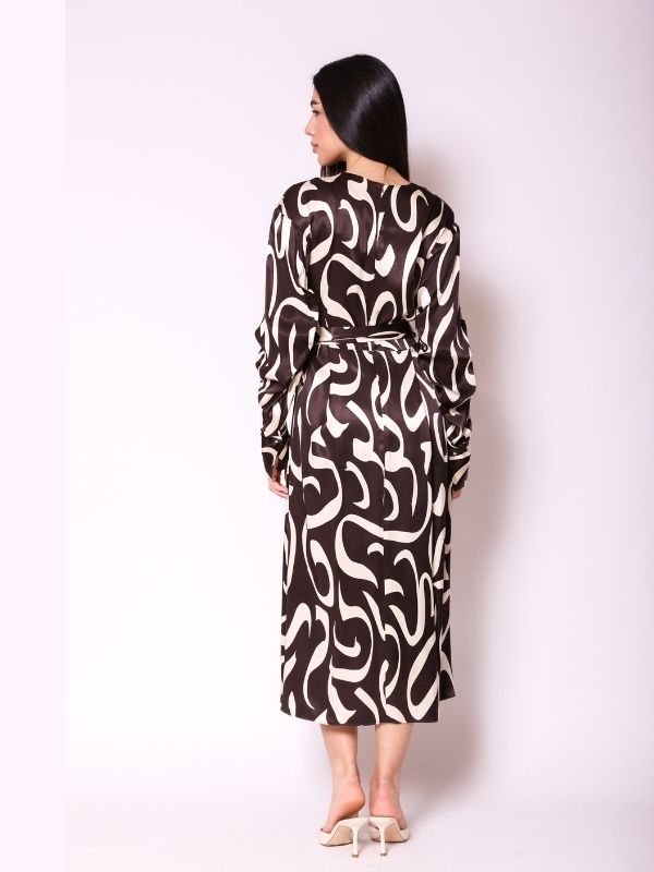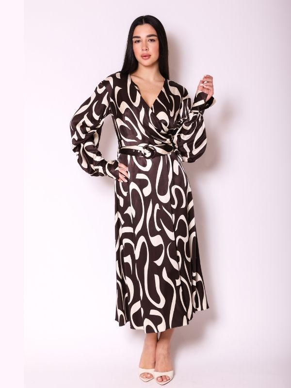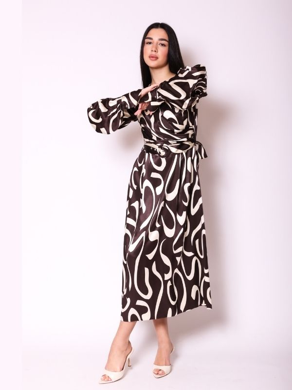Haljina prava avangarda. Prednji deo na preklop romantično pada u bogatim naborima, stvarajući elegantan V izrez i senzualan izgled. Naborani rukavi sa širim manžetnama koje se kopčaju na dužini dodaju sofisticiran detalj. Duga haljina laganog pada krasi kaiš sa šnalom, čineći je savršenim izborom za svečane prilike.