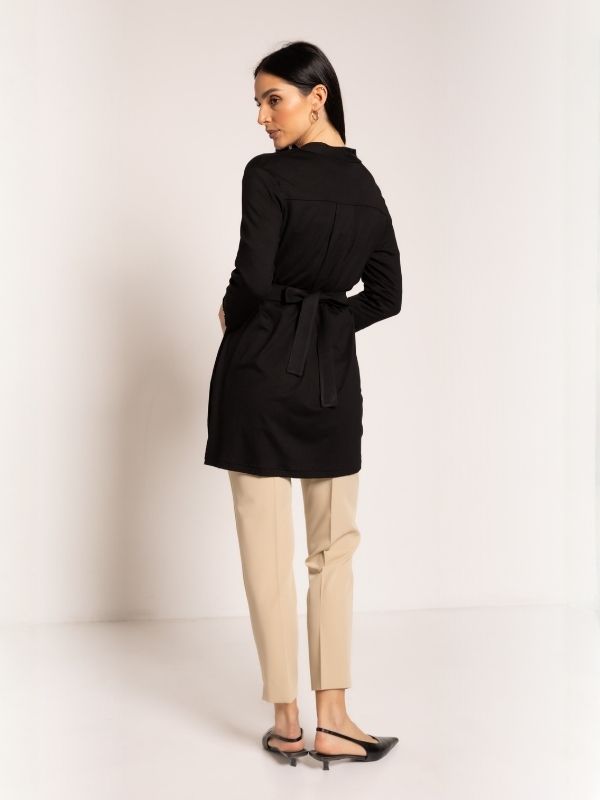 Dug kardigan sa ¾ rukavima, koji možete nositi vezan kaišem za elegantan, strukirani izgled ili opušteno, da lagano pada i stvara ležeran, sofisticiran stil. Univerzalan komad koji se lako kombinuje sa ostatkom prolećnih outfita iz AMC kolekcije.