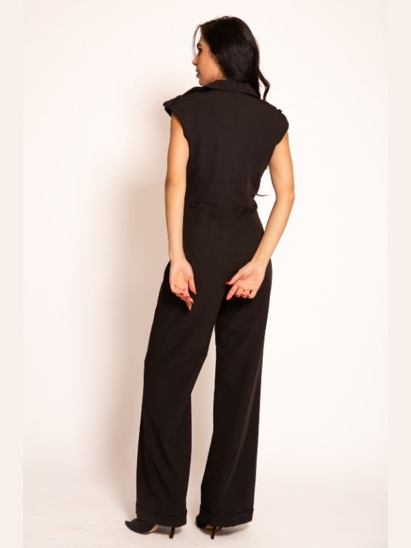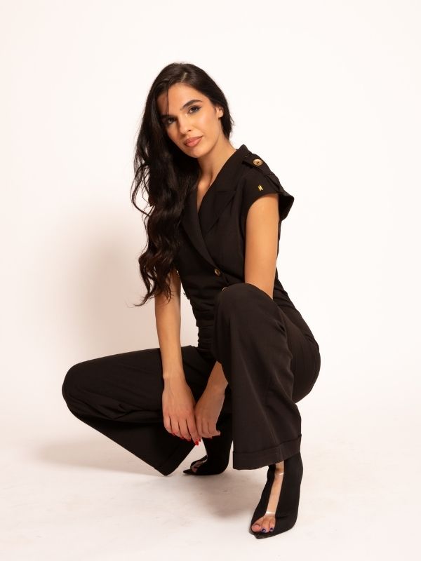 Kombinezon besprekorne konstrukcije savršeno prati liniju tela, pružajući elegantan i samouveren izgled. Izražene naramenice i dubok dekolte sa profinjenim reverima naglašavaju gornji deo, dok dvoredna imitacija kopčanja sa zlatnim dugmadima povezuje model sa prepoznatljivom estetikom cele kolekcije. Duge nogavice sa manžetnama dodaju strukturu i sofisticiran završetak. Zahvaljujući luksuznim detaljima i univerzalnom kroju, ovaj kombinezon je idealan izbor i za svečane prilike i za moderan, urbano-elegantan dnevni i večernji outfit.
