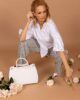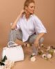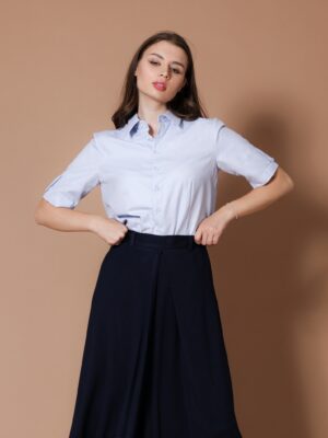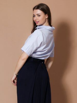 Oversize košulja od puplina. Potpuno drugačije forme rukava sa ranglan rukavom, kao kimono rukav koji dozvoljava tu glamuroznost i oversize efekat. Na leđima se nalazi velika falta koja kreće iz same kragne. Prednjica je kraća.