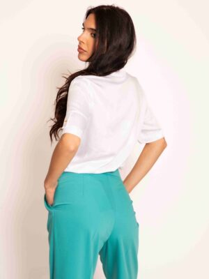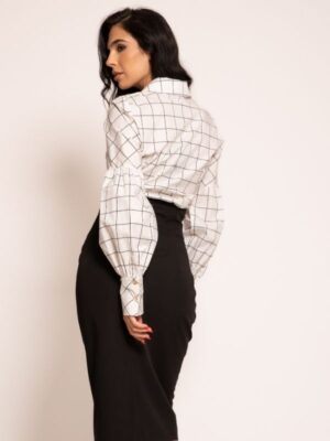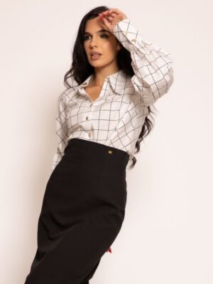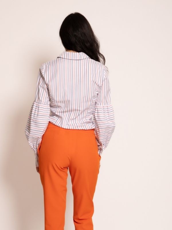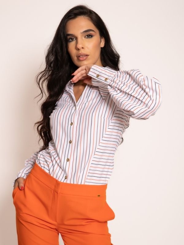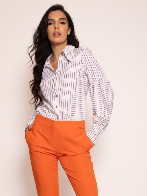 Košulja donosi pravu avangardu u modni izraz. Efekat je fokusiran na rukave, koji su od lakta nabrani kako bi se stvorio balon oblik i voluminozna silueta, dok manžetne sa zlatnim dugmićima unose trendovski i luksuzan pečat. Model se kopča na prednjici nizom dugmića, a krasi ga produžena kragna sa izraženim špic završecima za dodatnu dozu sofisticiranosti. Savršeno se kombinuje sa topom IQ00 i suknjom IS40, stvarajući upečatljiv i luksuzan outfit, ali i lako pronalazi svoje mesto u kombinaciji sa drugim AMC modelima.