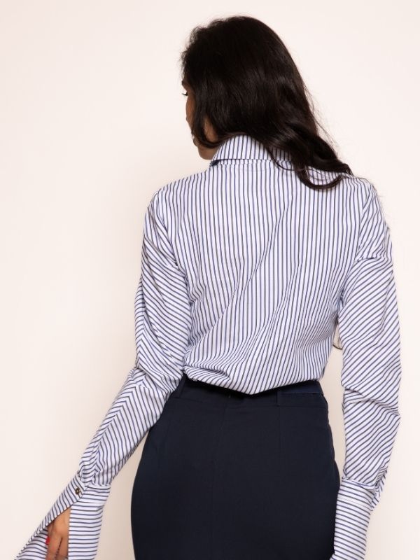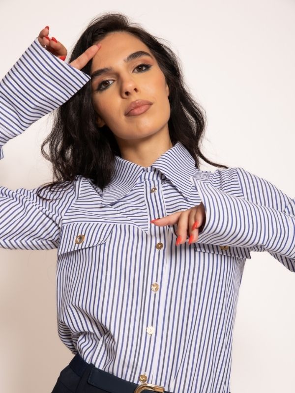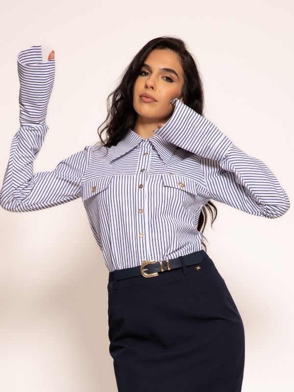 U ovom modelu svaka linija govori o luksuzu i samopouzdanju. Košulja sa arhitektonski definisanom kragnom i precizno postavljenim džepovima na grudima otkriva sklonost ka detaljima koji nikada ne prolaze nezapaženo. Niz diskretno blistavih dugmadi prati centralnu liniju, naglašavajući vertikalnu eleganciju siluete. Visoke pantalone, krojene poput modne skulpture, ističu figuru i produžuju liniju noge, dok raskošno formiran pojas sa upečatljivim kopčanjem pruža moćan vizuelni akcenat. Rezultat je sofisticirana silueta koja istovremeno zrači profinjenošću i neospornom modnom snagom – kreacija koja se ne nosi, već osjeća.