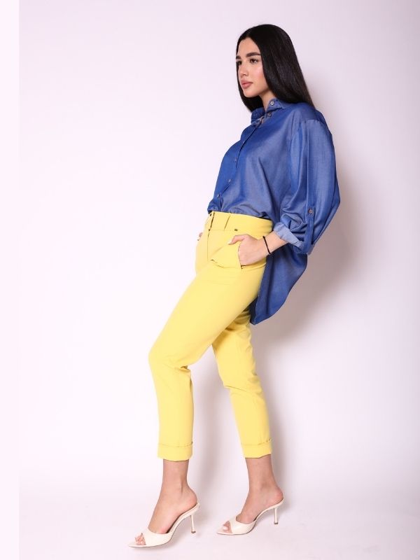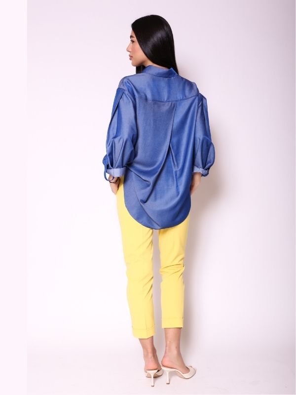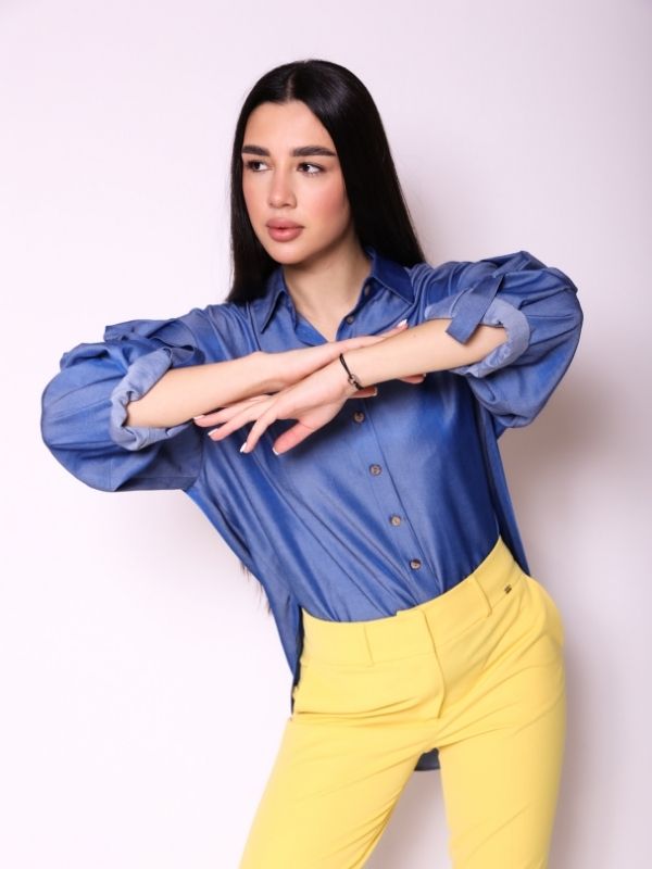 Oversize košulja, moderan i funkcionalan komad, savršeno prilagodljiv različitim stilovima. Svedenog kroja sa klasičnom kragnom i kopčanjem duž prednjice, ovaj model odiše vanvremenskom elegancijom. Rukavi 3/4 dužine sa tankom manžetnom mogu se savijati i kopčati, omogućavajući individualnu kontrolu dužine i dodatnu svestranost. Velika centralna falta na leđima pruža ležeran komfor, dok šlicevi na bokovima omogućavaju slobodu pokreta i raznovrsne stilizacije – prednji deo košulje može se nositi opušteno ili delimično upasan u pantalone. Savršen izbor za urbane, savremene outfite, lako kombinovan sa ostalim komadima iz AMC kolekcije, za sofisticiran, a opušten izgled.