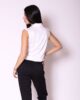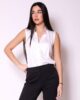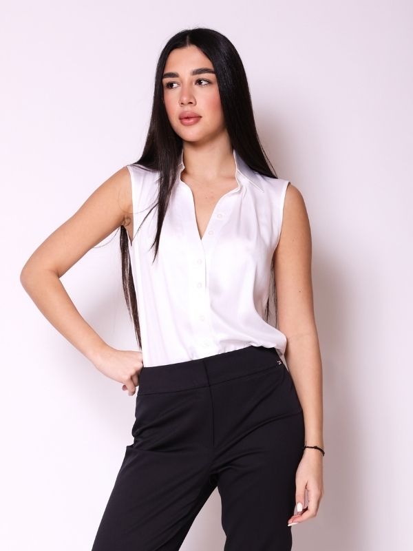 Košulja bez rukava sa izraženijom, prefinjeno stilizovanom kragnom koja unosi moderan i sofisticiran detalj. Prednji deo krasi pažljivo oblikovana igra falti, koja dodaje dinamiku i vizuelnu dubinu modelu. Kopča se centralno, dugmićima, dok na V izrezu diskretno našivena dugmad imitiraju kopčanje, unoseći suptilnu notu elegancije i luksuza. Sveden, a upečatljiv model, idealan za sve prilike, od poslovnih kombinacija do elegantnih dnevnih outfita.