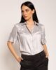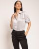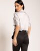Košulja izrađena od izuzetno prijatne viskoze pruža osećaj lakoće i komfora tokom prolećnih dana. Model ima kratke rukave sa diskretnim šlicem po dužini, koje krase srebrni drikeri kao moderan i funkcionalan detalj. Kopčanje je postavljeno centralno duž prednjice i izvedeno dugmićima, dok klasična kragna daje modelu besprekornu formu. Zahvaljujući svom svedenom, ali efektom bogatom dizajnu, košulja se lako kombinuje uz suknje i pantalone i savršeno se uklapa u AMC kolekciju.