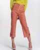 Model dubokih zvonastih pantalona 7/8 krase patne provučene kroz gajke na dužini nogavice, gde se kopčaju presvučenim dugmetom od osnovnog materijala. Model se kopča rajsferšlusom i muškom kopčom. Prednji i zadnji deo krase ušitci na bočnim delovima. Model se radi u inovativnom, autorskom dezenu sa kombinacijom teget pliša-presvučenim dugmićima.