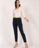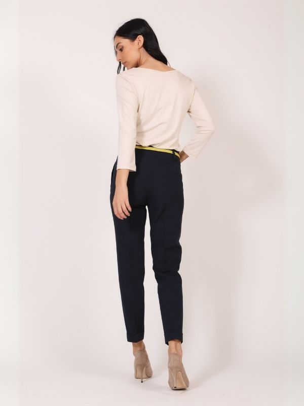 Pantalone 7/8 su klasičnog kroja, cigaret forme, sa dva kosa džepa na bočnom delu. Krase je manžetne na nogavicama. Klasične je dubine. Na zadnjem delu nalaze se dva ušitka koja savršeno prate liniju ženske figure, i mali paspul. Model je rađen od kvalitetnoe prade. Idealan model koji se uklapa u raznoliku ponudu AMC kolekcije.