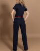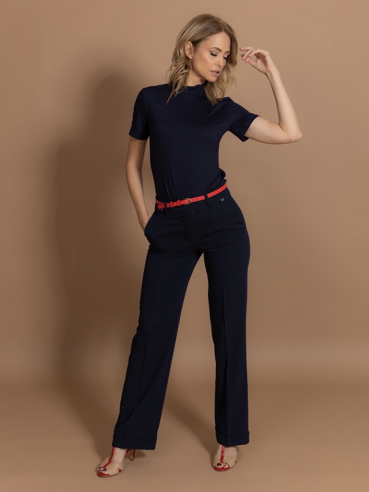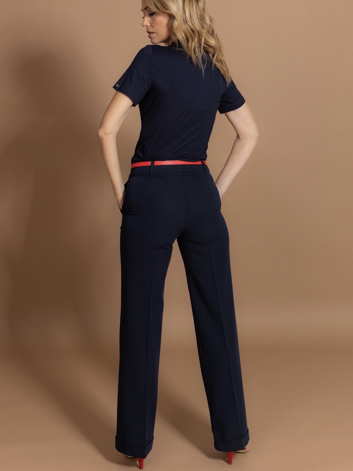 Basic duge pantalone sa manžetnom idealne konstrukcije i kroja. Standardna dubina, sa kopčanjem pomoću rajsferšlusa i muške kopče, kosih bočnih džepova.Krase je gajke, tako da se model može kombinovati sa kožnim kaiševima iz AMC kolekcije.