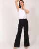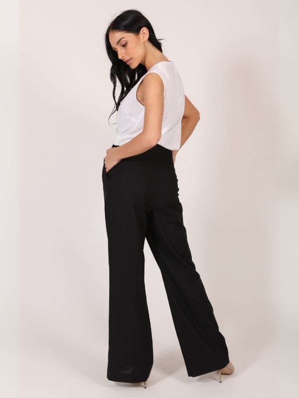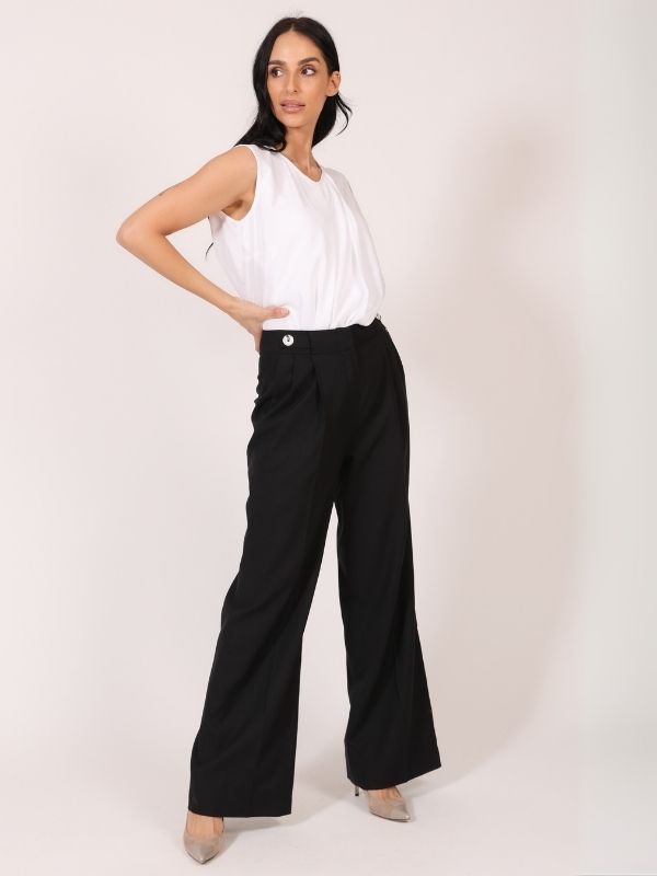 Elegantne duge pantalone u jednobojnoj varijanti, širokog kroja sa velikim faltama na prednjici. Kopčanje je izvedeno rajsferšlusom i dugmetom, a poseban akcenat daje imitacija kaiša na pojasu, koja se takođe zatvara dugmetom. Zadnji deo pantalona ostaje čist i jednostavan, omogućavajući lako kombinovanje sa raznim gornjim delovima. Ove pantalone odišu sofisticiranošću i lakoćom, čineći ih idealnim izborom za dnevne i večernje prilike.