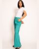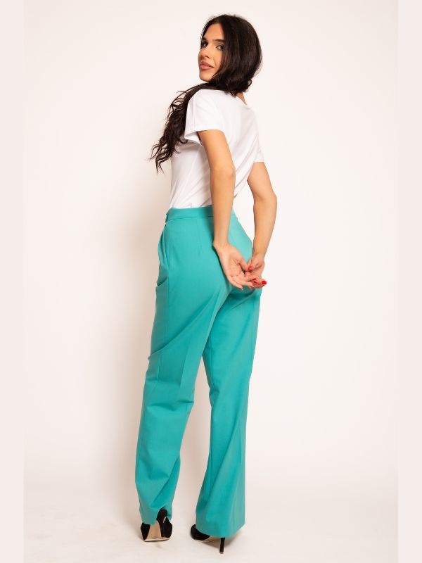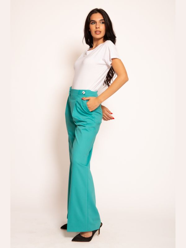 Elegantne duge pantalone u jednobojnoj varijanti, širokog kroja sa velikim faltama na prednjici. Kopčanje je izvedeno rajsferšlusom i dugmetom, a poseban akcenat daje imitacija kaiša na pojasu, koja se takođe zatvara dugmetom. Zadnji deo pantalona ostaje čist i jednostavan, omogućavajući lako kombinovanje sa raznim gornjim delovima. Ove pantalone odišu sofisticiranošću i lakoćom, čineći ih idealnim izborom za dnevne i večernje prilike.