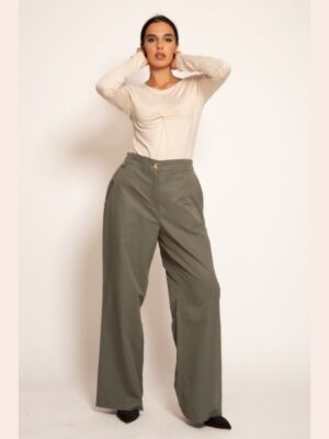 Pantalone visokog pojasa odišu minimalizmom, ali istovremeno plene modernim izgledom. Dugih nogavica koje se pri dnu šire u suptilan zvonasti oblik, pružaju lagan pad i lepršav pokret. Precizno oblikovani ušitci na prednjem i zadnjem delu dodatno naglašavaju ženstvenost i savršenu formu ovog modela. Jednako prikladne za svakodnevne modne kombinacije i posebne svečane prilike, ove pantalone su vanvremenski komad koji unosi eleganciju i samopouzdanje u svaki stil.