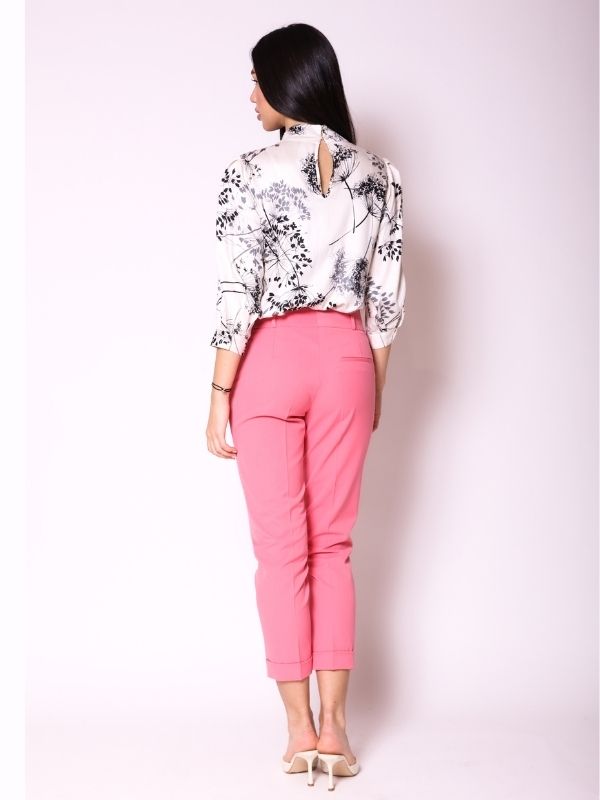 Elegantne pantalone 7/8 cigaret kroja izrađene od vrhunskog kvalitetnog kepera, pružaju moderne linije. Sa dva kosa džepa na bočnim stranama, ove pantalone nude praktičnost i stilski šarm, dok manžetne na nogavicama dodaju dašak urbanog stila. Klasična dubina savršeno oslikava žensku figuru, dok na zadnjem delu dva pažljivo pozicionirana ušitka nežno prate liniju tela, upotpunjena malim paspulom koji je pravi detalj za eleganciju. Ovaj model je savršeni dodatak raznolikoj AMC kolekciji, pružajući besprekornu kombinaciju udobnosti, stila i kvaliteta.