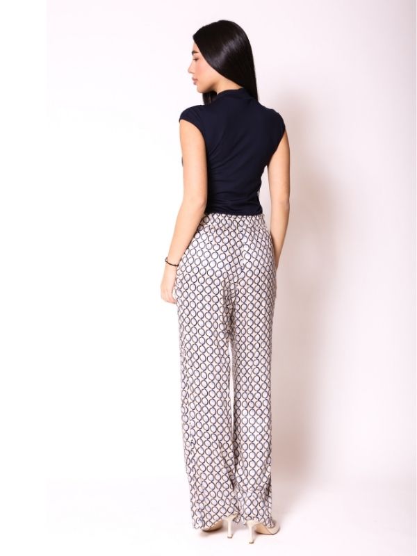 Pantalone široke forme pružaju lagan i ležeran izgled, savršene za opuštene dane. Sa džepovima na bočnim delovima, donose funkcionalnost i udobnost, dok lastiš u celom obimu omogućava savršen stil. Izrađene od zanimljivog grafičkog dezena, ove pantalone su idealne za kombinovanje sa drugim modelima iz outfita, donoseći dinamiku i modernu notu svakodnevnim kombinacijama. Lako se uklapaju u razne stilove, a njihov jedinstven dezen čini ih nezamenjivim komadom u garderobi.