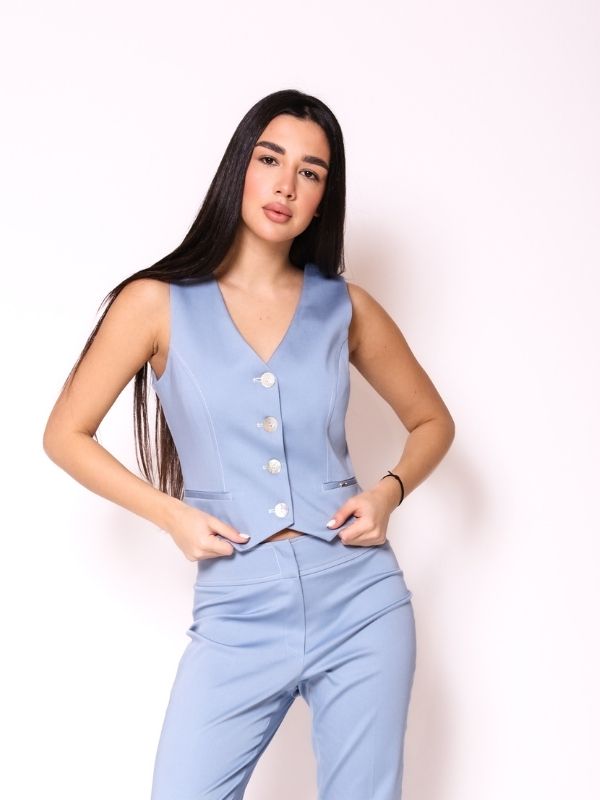 Prsluk uže forme pravi je atraktivan komad za ljubiteljke modernog i odvažnog stila. Dubok V izrez vizuelno izdužuje siluetu, dok se model funkcionalno i dekorativno kopča niz prednji deo dugmićima, naglašavajući liniju tela. Poseban dizajnerski akcenat čini završetak prednje dužine u špicu sa obe strane, koji modelu daje dodatnu dinamiku i avangardan karakter. Zadnji deo se vezuje u mašnu, omogućavajući prilagođavanje struka i dodatno isticanje ženstvene siluete. Zahvaljujući kratkoj formi, savršeno se uklapa uz duboke pantalone iz AMC kolekcije, ali se može nositi i kao samostalan gornji komad ili slojevito preko bluze ili košulje za sofisticiran i urban izgled.