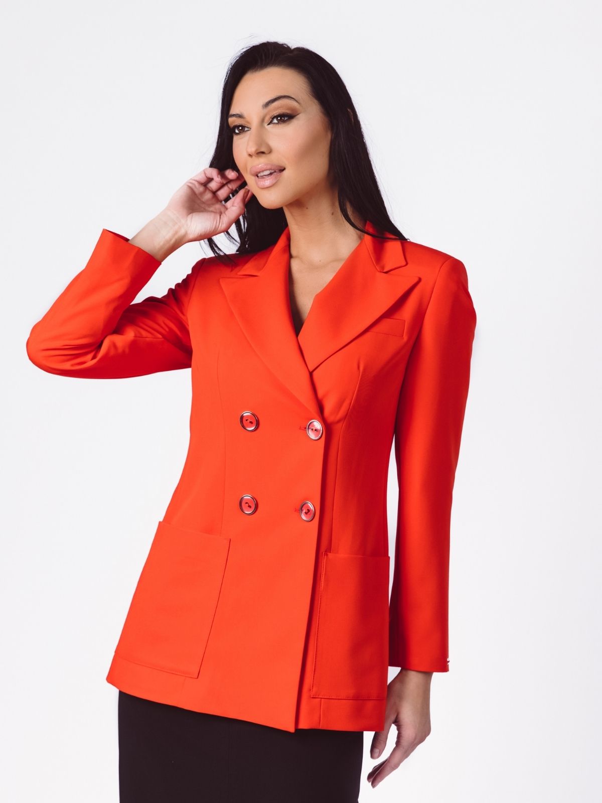 Oversize Sako perfektne konstrukcije i savršenog klasičnog kroja, sa dvorednim kopčanjem, sa ukrasnim providnim dugmićima. Na sebi ima špic rever, ušitak u delu struka. Ciger lajsna na levoj prednjici sakoa krasi ovu konstrukciju sakoa. Na prednjem delu su našiveni džepovi većih dimenzija koji pružaju estetsku harmoniju. Ova vrsta Oversize sakoa idealan je za kombinovanje uz Prsluk 070U i Pantalone 085U.