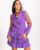 Trend presečenih rukava je upravo ono što ovaj sako ima, sa formom rukava od košulje, sa manžetnama. Kombinacija čipke u nijansama narandžasta/ljubičasta, geometrijske forme. Zanimljivo asimetrično kopčanje dugmadima koje stvaraju formu trougla. Prednjicu krase patne na bokovima. Model je velika inovacija i prati potpuno novi trend AMC stila. Može se kombinovati sa pantalonama i suknjama iz nove jesenje kolekcije.