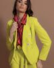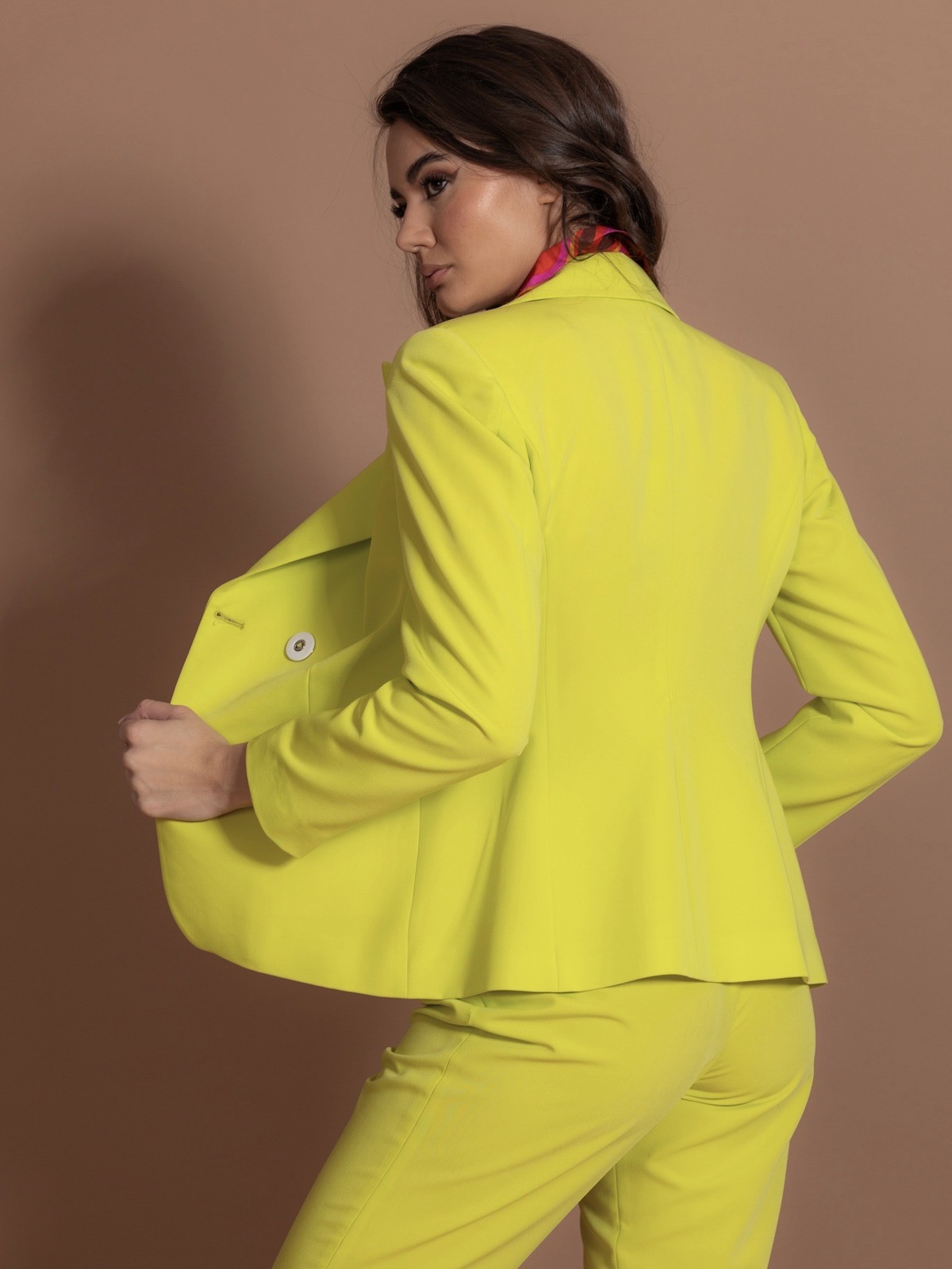 Sako sa novom vrstom dvorednog kopčanja i špic reverom. Kombinacija dugmeta koja prati celu kolekciju I novi trend kao kombinacija na samom modelu, daje mu jednu harmoniju I razigranost. Paspul džepovi su sa bočnih strana. Vizuelno asimetričan model koji savršeno prati liniju tela i ističe žensku figuru.