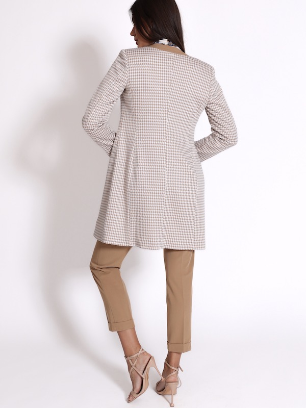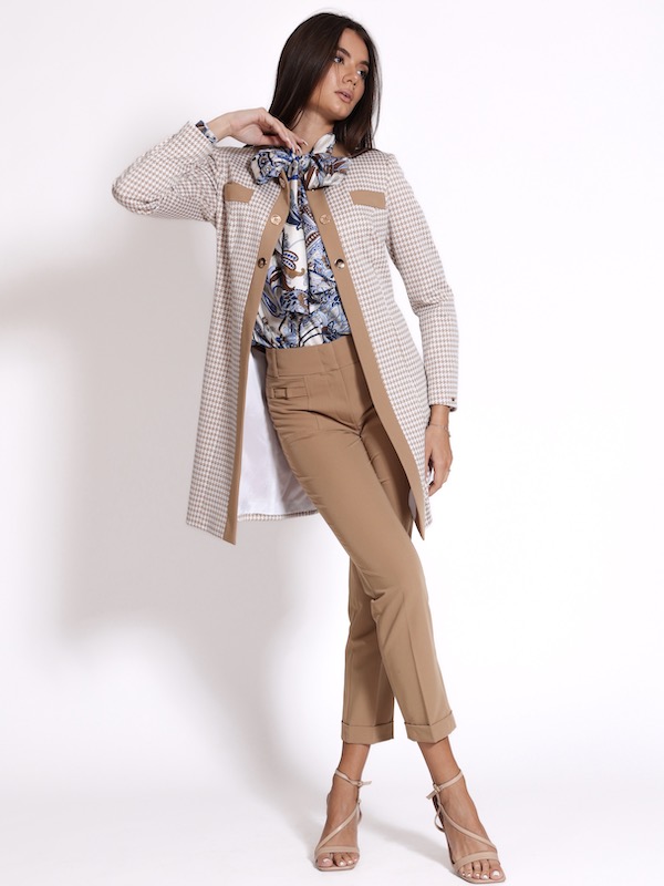 Produženi sako/mantil dugih rukava. Izražuje se u pepito dezenu kao prepoznatljiv AMC dezen, u kombinaciji sa smirenim estuko bež tonom. Dezen pepito u kombinaciji sa viskozom sa satenskim izgledom. Zlatna dugmad prednicu čini elegantnijom i prefinjenijom, razbija nežne tonove. Krase ga mali paspuli sa istim dugmadima. Model u kombinaciji sa dezenom čini savršenstvo i harmoniju svakog outfita.