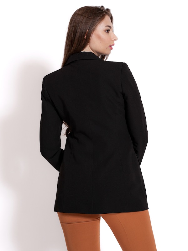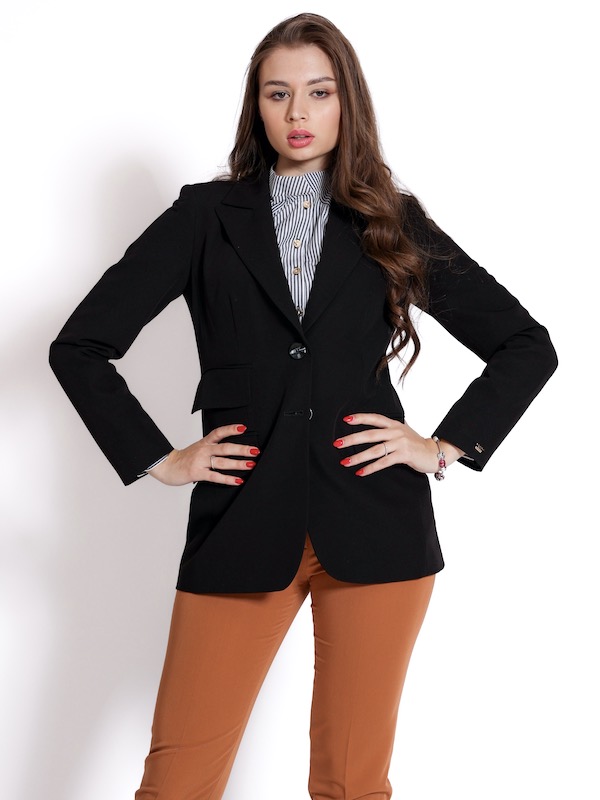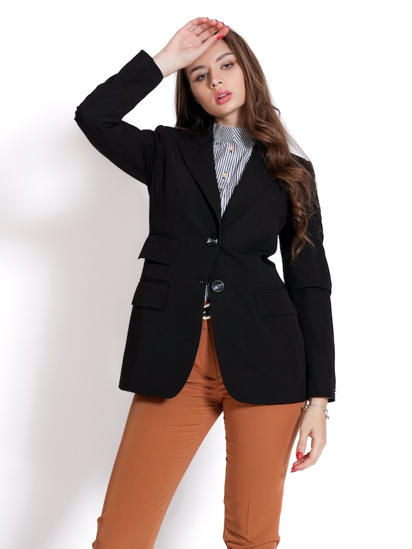Dug sako, savršene konstrukcije i kroja. Pojačava struk, izdužuje figuru. Krase ga patne koje se nalaze na bočnom prednjem delu. Ima špic rever, i duge rukave. Model je savršene vizuelne estetike, gde se idealno može uklopiti u celu novu jesenju AMC kolekciju.