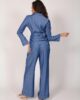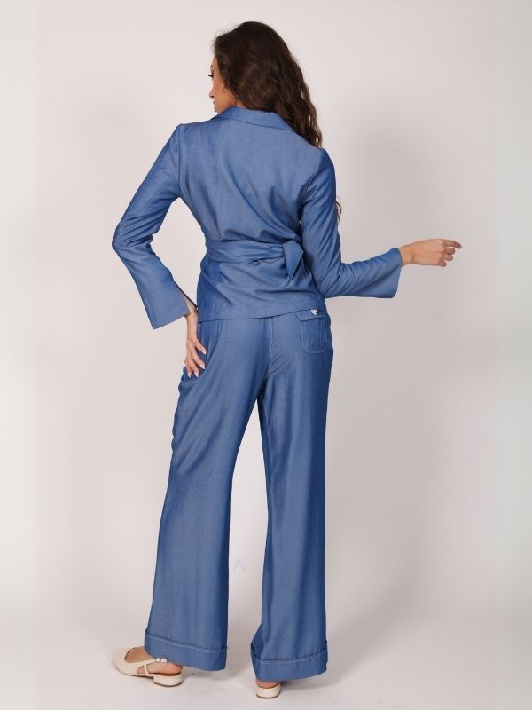 Moderan i elegantan sako dugih rukava, napravljen od tankog jeansa, savršen je spoj sofisticiranosti i ležernog stila. Spušteni rever i šlicevi na rukavima dodaju mu moderan šarm, dok se umesto klasičnog kopčanja vezuje kaišem na leđima, naglašavajući figuru i donoseći inovativan twist. Imitacija džepa sa leve strane boka ističe minimalistički dizajn, čineći ovaj sako idealnim za urbane modne kombinacije i slojevite stylinge.