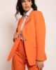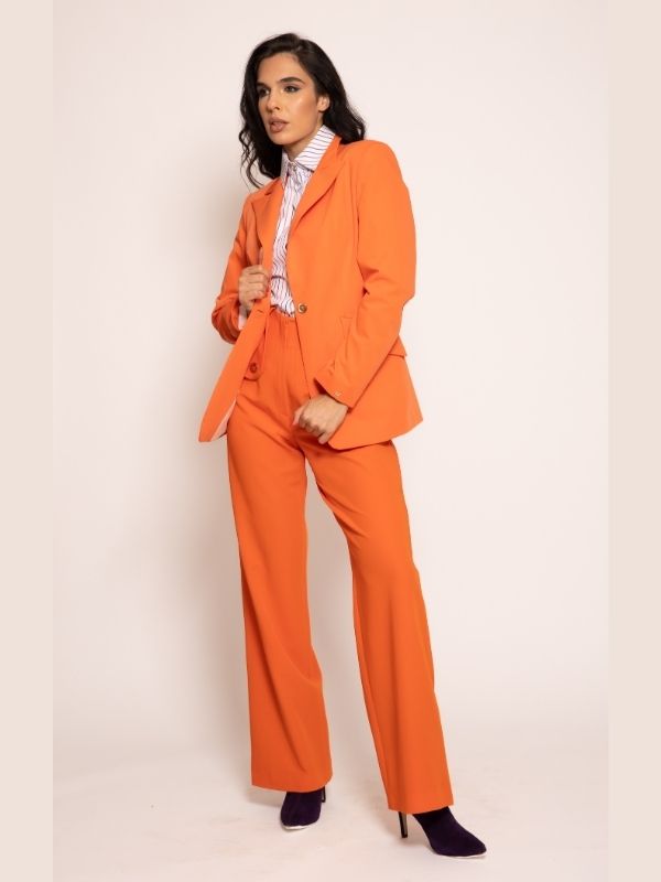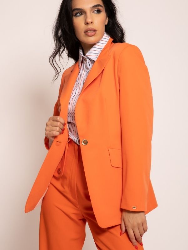 Sofisticirana elegancija za svaku priliku. Model izrađen od kvalitetnog štofa, ovaj sako donosi spoj klasične forme i modernog izraza. Blago duži kroj od standardnog modela vizuelno izdužuje siluetu, naglašavajući ženstvenu liniju tela i pružajući savršen balans stila i elegancije. Špic rever i džepovi sa kosom patnom na prednjim bočnim delovima dodaju upečatljive, ali suptilne detalje, dok uzani rukavi čuvaju profinjen, klasičan izgled. Lako se kombinuje sa ostalim komadima iz AMC kolekcije, kreirajući vanvremenski look koji podjednako pristaje poslovnim, svečanim i urbanim prilikama.