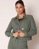 Sako dugih, uskih rukava odiše sofisticiranošću i pažljivo osmišljenim detaljima. Klasična kragna i zlatna dugmad koja stvaraju V oblik dodaju autentičan modni pečat, dok našiveni elementi na rukavima i diskretne patne na bokovima unose dozu igre i teksture. Kratka silueta čini ga savršenim za slojevite kombinacije sa bluzama i majicama iz nove kolekcije, pružajući ženstvenu eleganciju u svakodnevnom jesenjem stilu.