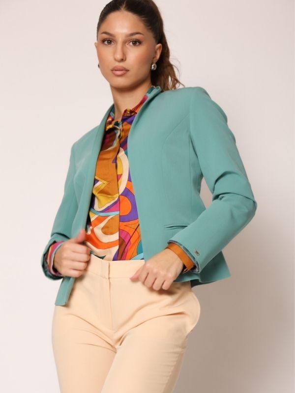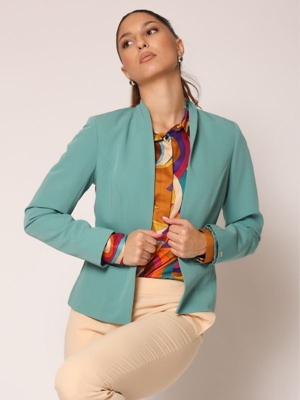 Sako dugih rukava donosi osveženje klasičnoj formi zahvaljujući dizajnu bez kopčanja, što mu daje ležernu, ali profinjenu notu. Umesto standardne kragne, ističe se pročišćen gornji deo sa zanimljivom igrom krojnih linija, dok paspul džepovi na bokovima dodaju diskretnu eleganciju. Klasična dužina i svestran dizajn čine ga savršenim izborom za basic svakodnevne kombinacije, ali i za svečane prilike kada želite minimalizam sa stavom. Lako se uklapa uz pantalone, haljine ili suknje, stvarajući izgled koji je istovremeno moderan i vanvremenski.