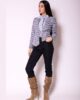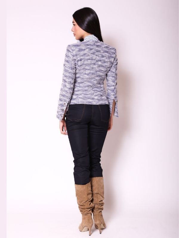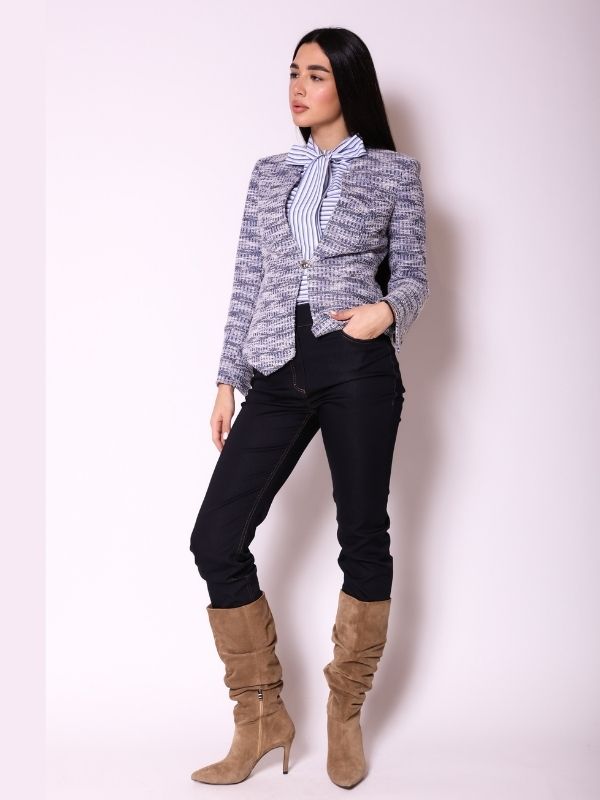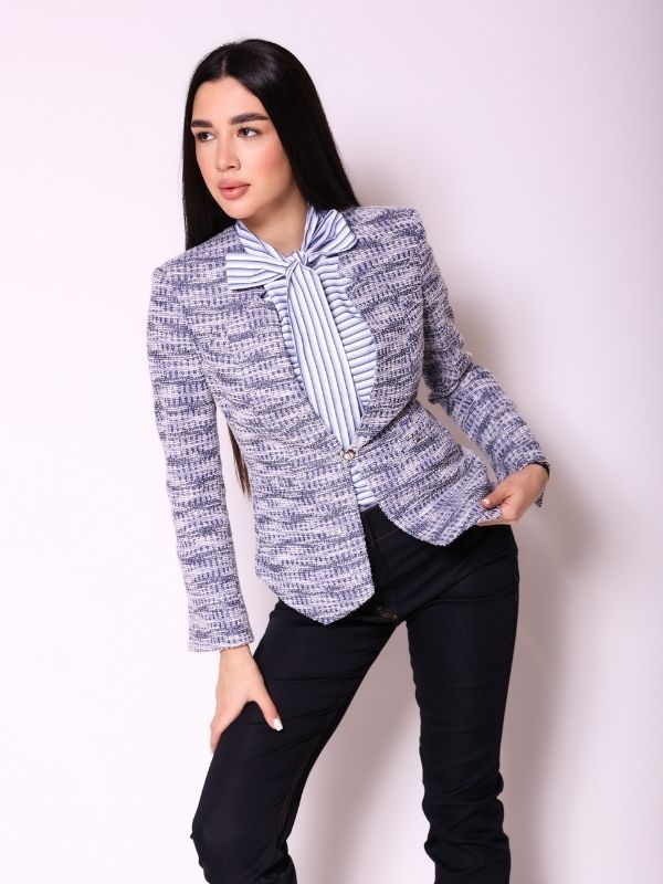 Veoma ustručen i sofisticiran sako koji odiše damskom elegancijom i promišljenim dizajnom. Model je bez klasične kragne, a umesto nje ističe se zanimljivo sečenje koje daje čist i moderan izgled gornjem delu. Poseban akcenat stavljen je na dužinu sakoa, čiji špicasti završeci donose dozu avangarde i vizuelne dinamike. Dugi rukavi imaju šlic koji formira blagu zvonastu siluetu, dodatno naglašenu dekorativnim drikerima. Ovaj sako je idealan izbor za žene koje neguju sofisticiran stil i traže komad koji istovremeno deluje elegantno, moderno i vrlo ženstveno. Savršeno se uklapa uz haljine, suknje ili pantalone iz AMC kolekcije, za posebne prilike i elegantne dnevne kombinacije.