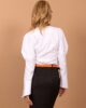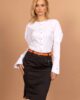Pensil suknja u inovativnijoj formi sa asimetričnom formom dodatom u vidu španglice sa malom alkom sa desne strane prednjice. Klasične dubine pojasa, sa gajkama, malo duža od pelsil standardne suknje. Šlic je sa bočne strane.
