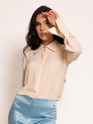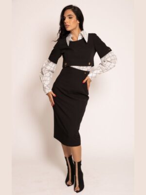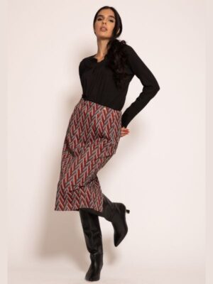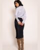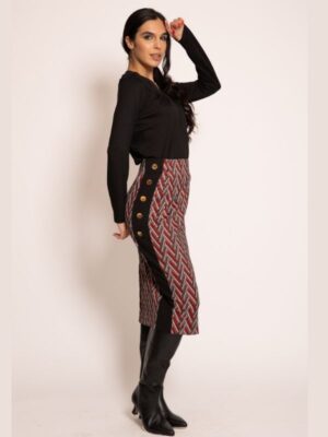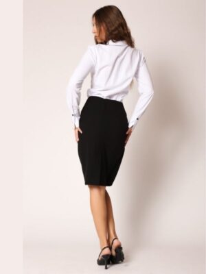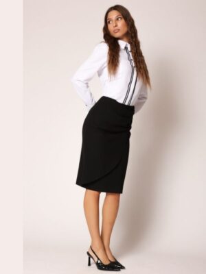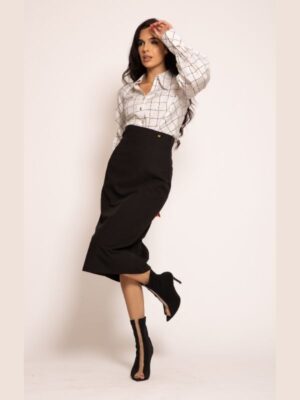 Suknja savršene konstrukcije i profinjene forme dužine do malo ispod kolena odiše elegancijom i suptilnom senzualnošću. Bočni šlic pruža lakoću pokreta i diskretno naglašava liniju noge, dok niz zlatnih dugmadi na prednjem delu dodaje luksuzan vizuelni akcenat i prepoznatljiv AMC pečat. Zahvaljujući svojoj univerzalnoj formi, ovaj model se savršeno kombinuje sa bluzama, sakoom ili topom iz kolekcije, čineći ga ključnim komadom za sofisticirane modne kombinacije.