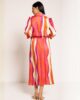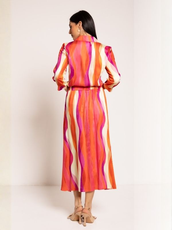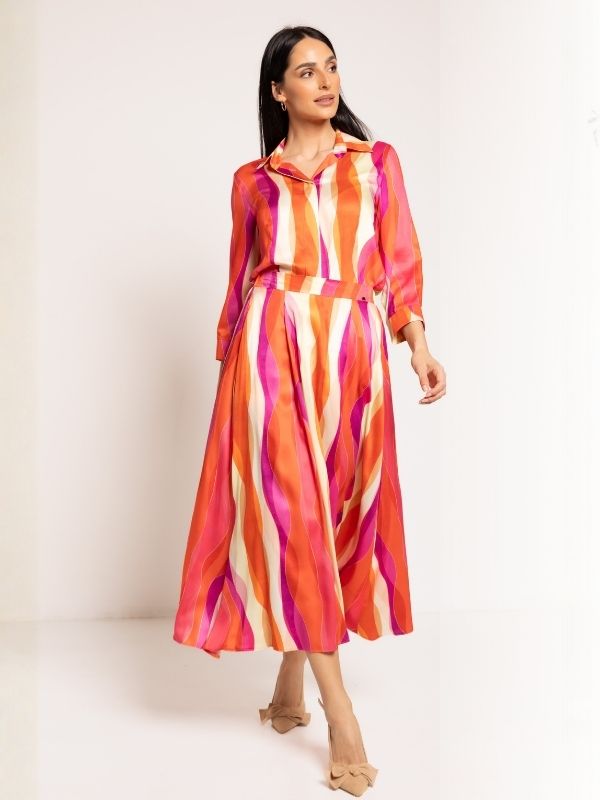 Duga suknja od štofa odiše senzualnošću i prefinjenošću, zahvaljujući velikim elegantnim faltama koje joj daju glamurozan, ali i dinamičan izgled. Savršeno se uklapa sa bluzom u istom dezenu, stvarajući efekat lepe haljine, dok dodatak kaiša unosi dašak stila i ističe siluetu. Idealna za svečane prilike ili večernje izlaske, ova suknja je simbol elegancije, koja se lako kombinuje sa različitim gornjim delovima iz kolekcije.
